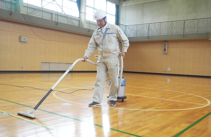 ユカフレッシュを塗布する前に体育館床面を掃除機もしくはモップでから拭きしてゴミや綿埃を取り除いてください。